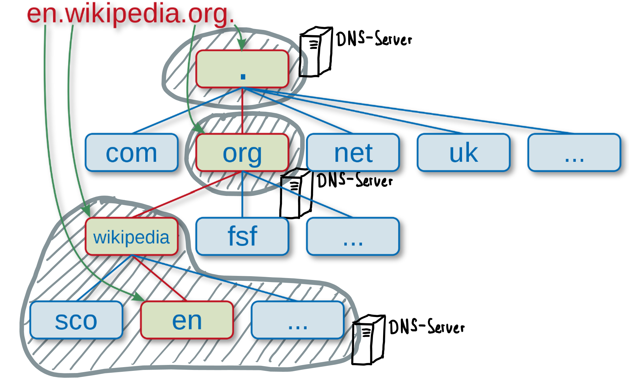 Im Bild sind drei DNS-Server mit ihrer jeweiligen Zone (grau) eingezeichnet. Jeder DNS-Server verwaltet den Teil der Adressinformationen, der zu seiner Zone gehört. Die IP-Adresse zum Domain-Namen en.wikipedia.org, also 91.198.174.192, kennt dabei nur der unterste DNS-Server, denn er ist für die Zone, in welche dieser Domain-Name schliesslich gehört, zuständig.