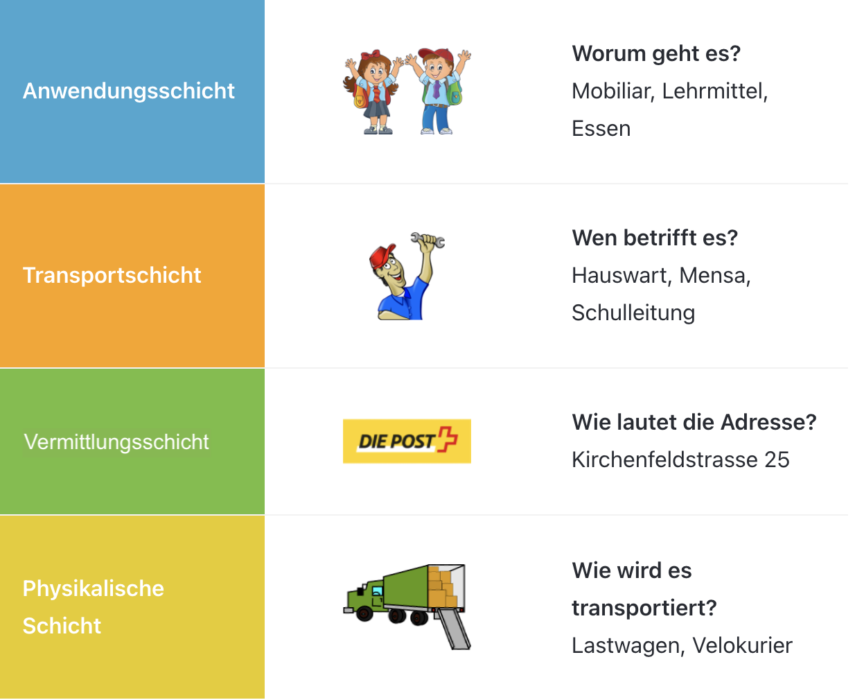 Wenn wir im TCP/IP-Schichtenmodell die Schichten ansehen, dann ist jede Schicht für einen bestimmten Schritt zuständig.