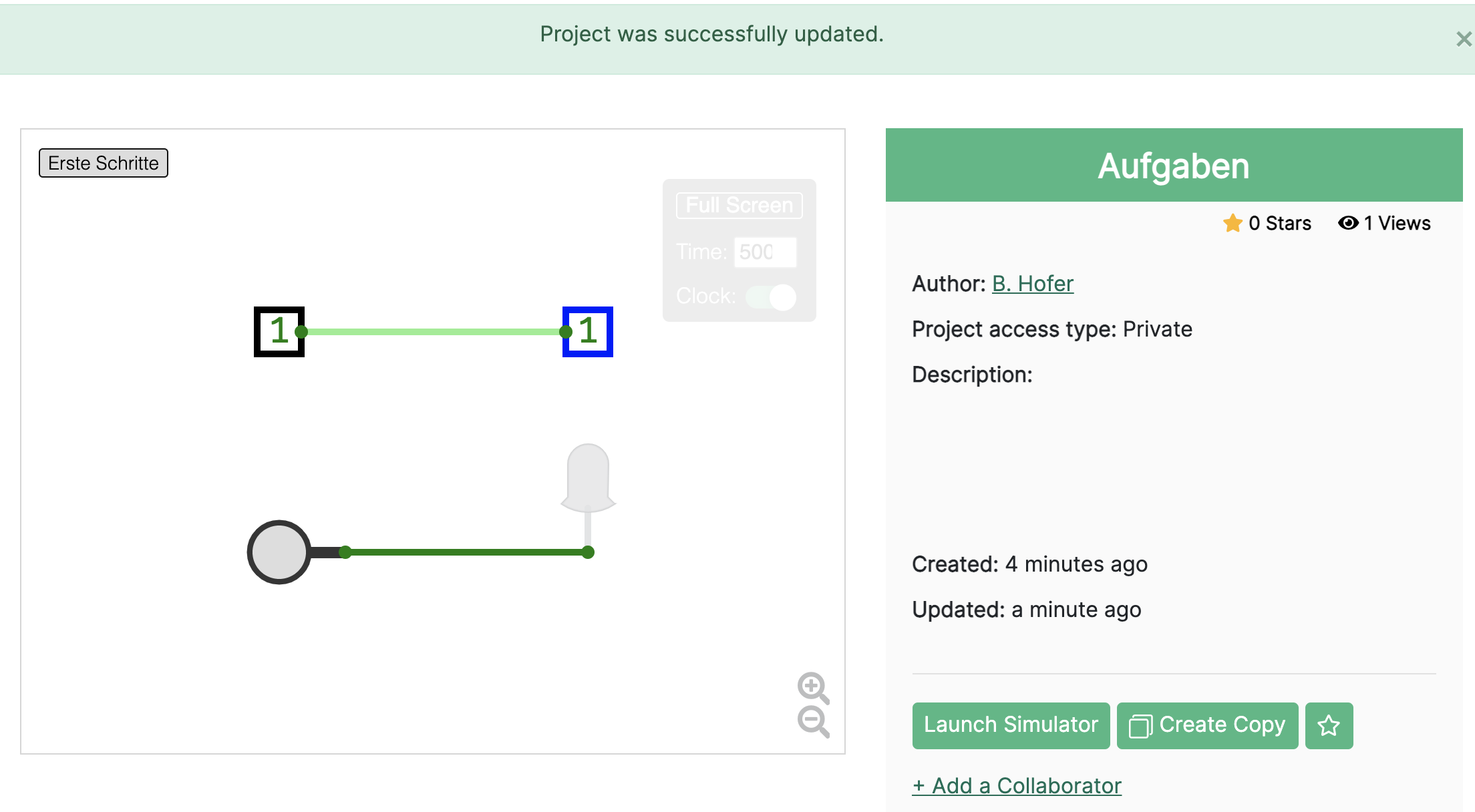 Anschliessend können Sie das Projekt speichern (durch Klicken auf Save Online in der Toolbar). Dabei wählen Sie am besten aus, dass es sich um ein privates Projekt handelt. Schliesslich klicken Sie auf Update Project. Nun sehen Sie das Projekt in der Übersicht. Es ist gespeichert und Sie können es jederzeit wieder durch einen Klick auf Launch simulator öffnen.