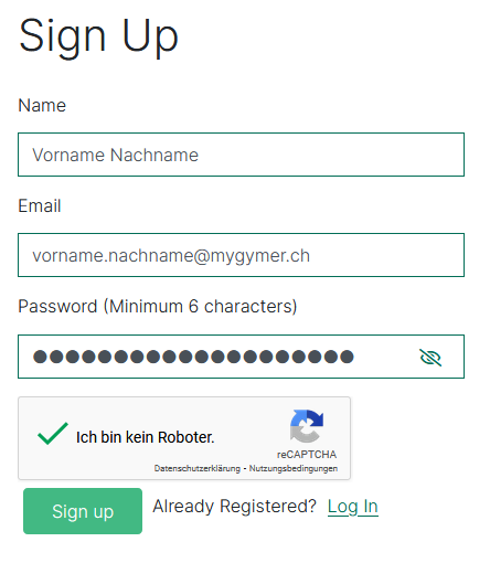 Schliesslich füllen Sie die Benutzerdaten aus (am besten die Schul-E-Mail-Adresse angeben) und klicken auf den grünen Sign up-Knopf: